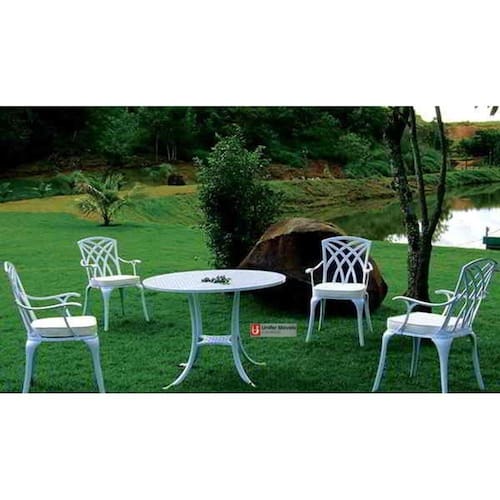 Com o conceito de prático, leve e resistente, o Conjunto Geneva com Mesa de 1,00 m e 4 Poltronas com a estrutura em alumínio fundido e com um lindo designer que combina tanto com o seu jardim quanto sua varanda ou até mesmo sua sala (Porque não!), para ambientes leves e rústicos. Com a "Pintura Eletrostática", que caracteriza-se pela elevada resistência à corrosão, ferrugem e oxidação podendo ser exposto a sol e chuva, e sem falar na praticidade para sua limpeza tornando seu produto com aquele aspecto de novo por muito mais tempo.