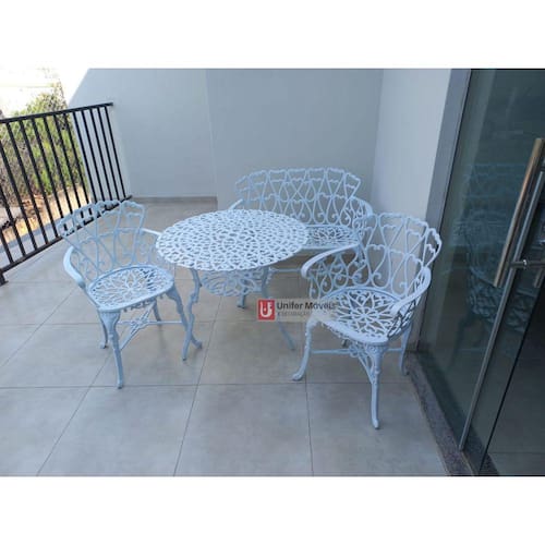 Especificações: 1 Mesa: 71 cm de altura x 80 cm de diâmetro. 2 Poltronas: 83 cm de altura x 41 cm de profundidade x 55 cm de largura. 1 Banco 2 lugares: 83 cm de altura x 41 cm de profundidade x 97 cm de largura. Cor: Branco. Material: Alumínio fundido. Tipo de pintura: Eletrostática. Vendemos almofadas separadamente. Requer montagem.