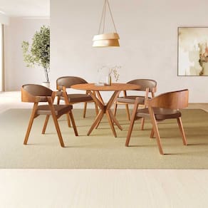 Com design sofisticado e acabamento impecável, este conjunto une o charme da madeira maciça ao conforto do estofamento em couro caramelo, criando um ambiente moderno e cheio de personalidade.