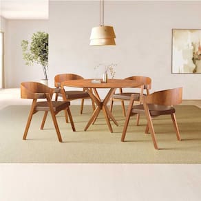 As Cadeiras Luna completam o conjunto com seu encosto curvo em madeira e assento estofado, garantindo conforto e elegância em cada refeição.