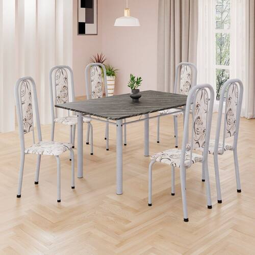 Este conjunto de mesa retangular e 6 cadeiras oferece estilo e praticidade. Com estrutura tubular em aço para estabilidade, o tampo em pedra ardósia adiciona sofisticação e resistência a riscos e manchas. As cadeiras combinam harmoniosamente com a mesa, garantindo conforto com estofamento. Ideal para diversos espaços, é perfeito para receber convidados ou desfrutar de refeições em família, criando um ambiente acolhedor e elegante. Medida da Mesa (A x L x P): 75,8 cm x 75 cm x 140 cm Peso da Mesa: 60,67 kg Mesa suporta até: 10 kg Acabamento da Cadeira/Banco: Pintura Texturizada Acabamento da Mesa: Pintura Texturizada Ambiente Principal: Sala de Jantar Cadeira/Banco estofada: Somente Assento Estofado Cadeira/Banco suporta até: 120 kg Complexidade da Montagem: Baixa: pode ser montado por uma pessoa sozinha Cor: Arabesco/ Mart Pérola Cor do Produto: Arabesco/ Mart Pérola Escala de Brilho: Semi-Brilho Espessura do Tampo: 15 mm Estrutura do Assento: Assento em MDP de 15mm c/ couríssimo. Itens Inclusos: 1 Mesa, 6 Cadeiras, Manual de Montagem e Ferragens. Manual de Montagem e Instalação: https://product-hub-prd.madeiramadeira.com.br/917834/documents/84342fb8-9dbe-4d6f-b16c-6e373a1d6cc02040633524617181306017506.pdf Material da Base da Mesa: Aço Material da Estrutura da Cadeira: Aço Material do Tampo: Ardósia Medida da Cadeira/Banco (A x L x P): 108 cm x 37 cm x 40 cm Medida do Tampo (L x C x E): 75 cm x 140 cm x 1,5 cm Necessita Montagem: Sim Origem do Produto: Nacional Peso da Cadeira/Banco: 3,82 kg Possui Apoio Para os Pés: Não Quantidade de Lugares: 06 Recomendações de Uso, Manutenção e Limpeza: Usar um pano de tecido macio e seco, evitar detergentes, alvejantes e produtos químicos de limpeza; no tampo usar tecido macio levemente umedecido. Sistema de Montagem: Parafusos