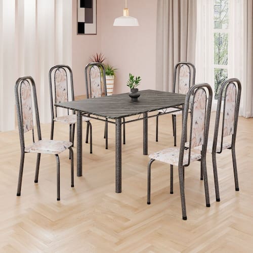 Este conjunto de mesa retangular e 6 cadeiras oferece estilo e praticidade. Com estrutura tubular em aço para estabilidade, o tampo em pedra ardósia adiciona sofisticação e resistência a riscos e manchas. As cadeiras combinam harmoniosamente com a mesa, garantindo conforto com estofamento. Ideal para diversos espaços, é perfeito para receber convidados ou desfrutar de refeições em família, criando um ambiente acolhedor e elegante. Medida da Mesa (A x L x P): 75,8 cm x 75 cm x 140 cm Peso da Mesa: 60,67 kg Mesa suporta até: 10 kg Acabamento da Cadeira/Banco: Pintura Texturizada Acabamento da Mesa: Pintura Texturizada Ambiente Principal: Sala de Jantar Cadeira/Banco estofada: Somente Assento Estofado Cadeira/Banco suporta até: 120 kg Complexidade da Montagem: Baixa: pode ser montado por uma pessoa sozinha Cor: Botanic Bege / Mart Prata Cor do Produto: Botanic Bege / Mart Prata Escala de Brilho: Semi-Brilho Espessura do Tampo: 15 mm Estrutura do Assento: Assento em MDP de 15mm c/ couríssimo. Itens Inclusos: 1 Mesa, 6 Cadeiras, Manual De Montagem E Ferragens. Manual de Montagem e Instalação: https://product-hub-prd.madeiramadeira.com.br/917798/documents/2a3a9672-6252-4f1e-8892-29b6a8f490ca2040633524617181306017506.pdf Material da Base da Mesa: Aço Material da Estrutura da Cadeira: Aço Material do Tampo: Ardósia Medida da Cadeira/Banco (A x L x P): 108 cm x 37 cm x 40 cm Medida do Tampo (L x C x E): 75 cm x 140 cm x 1,5 cm Necessita Montagem: Sim Origem do Produto: Nacional Peso da Cadeira/Banco: 3,82 kg Possui Apoio Para os Pés: Não Quantidade de Lugares: 06 Recomendações de Uso, Manutenção e Limpeza: Usar um pano de tecido macio e seco, evitar detergentes, alvejantes e produtos químicos de limpeza; no tampo usar tecido macio levemente umedecido. Sistema de Montagem: Parafusos