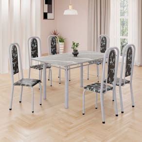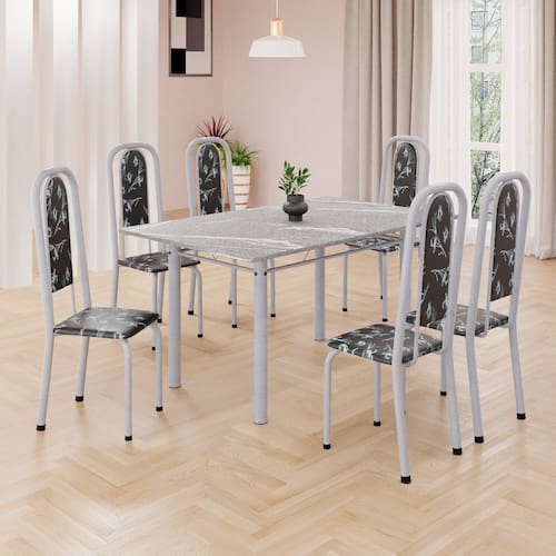 Este conjunto de mesa retangular e 6 cadeiras oferece estilo e praticidade. Com estrutura tubular em aço para estabilidade, o tampo em pedra granito adiciona sofisticação e resistência a riscos e manchas. As cadeiras combinam harmoniosamente com a mesa, garantindo conforto com estofamento. Ideal para diversos espaços, é perfeito para receber convidados ou desfrutar de refeições em família, criando um ambiente acolhedor e elegante. Medida da Mesa (A x L x P): 75,8 cm x 75 cm x 140 cm Peso da Mesa: 65,95 kg Mesa suporta até: 10 kg Acabamento da Cadeira/Banco: Pintura Texturizada Acabamento da Mesa: Polido Ambiente Principal: Sala de Jantar Cadeira/Banco estofada: Somente Assento Estofado Cadeira/Banco suporta até: 120 kg Complexidade da Montagem: Baixa: pode ser montado por uma pessoa sozinha Cor: Preto Floral/ Mart Pérola Cor do Produto: Preto Floral/ Mart Pérola Escala de Brilho: Semi-Brilho Espessura do Tampo: 15 mm Estrutura do Assento: Assento em MDP de 15mm c/ couríssimo. Itens Inclusos: 1 Mesa, 6 Cadeiras, Manual De Montagem E Ferragens. Linha ou Coleção: Lavínea Manual de Montagem e Instalação: https://product-hub-prd.madeiramadeira.com.br/917792/documents/7e11c104-c744-4d85-b87e-5b0bcce225d02040633524617181306017506.pdf Material da Base da Mesa: Aço Material da Estrutura da Cadeira: Aço Material do Tampo: Granito Medida da Cadeira/Banco (A x L x P): 108 cm x 37 cm x 40 cm Medida do Tampo (L x C x E): 75 cm x 140 cm x 1,5 cm Necessita Montagem: Sim Origem do Produto: Nacional Peso da Cadeira/Banco: 3,82 kg Possui Apoio Para os Pés: Não Quantidade de Lugares: 06 Recomendações de Uso, Manutenção e Limpeza: Usar um pano de tecido macio e seco, evitar detergentes, alvejantes e produtos químicos de limpeza; no tampo usar tecido macio levemente umedecido. Sistema de Montagem: Parafusos