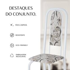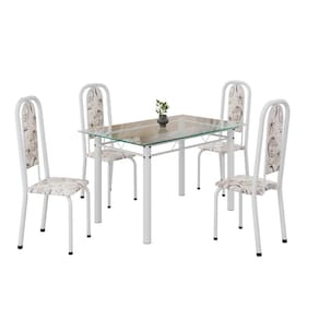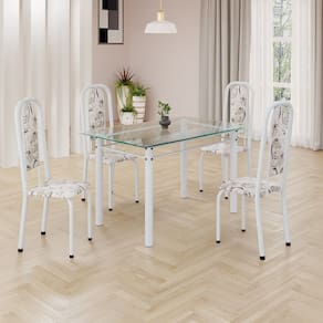 Este conjunto de mesa retangular e 4 cadeiras oferece estilo e praticidade. Com estrutura tubular em aço para estabilidade, o tampo em vidro adiciona sofisticação e resistência a riscos e manchas. As cadeiras combinam harmoniosamente com a mesa, garantindo conforto com estofamento. Ideal para diversos espaços, é perfeito para receber convidados ou desfrutar de refeições em família, criando um ambiente acolhedor e elegante. Medida da Mesa (A x L x P): 74,9 cm x 75 cm x 120 cm Peso da Mesa: 20,18 kg Mesa suporta até: 10 kg Acabamento da Cadeira/Banco: Pintura Texturizada Acabamento da Mesa: Polido Ambiente Principal: Sala de Jantar Cadeira/Banco estofada: Somente Assento Estofado Cadeira/Banco suporta até: 120 kg Complexidade da Montagem: Baixa: pode ser montado por uma pessoa sozinha Cor: Arabesco/ Branco Cor do Produto: Arabesco/ Branco Cor Secundária: Bege De Canto (Canto Alemão): Não Escala de Brilho: Semi-Brilho Espessura do Tampo: 6 mm Espessura do Vidro: 6 mm Estrutura do Assento: Assento em MDP de 15mm c/ couríssimo. Formato do Tampo: Retangular Itens Inclusos: 1 Mesa, 4 Cadeiras, Manual de Montagem e Ferragens. Manual de Montagem e Instalação: https://product-hub-prd.madeiramadeira.com.br/921319/documents/aff65476-ecd9-4be4-9007-374d5a01eae062040633524617181306017506.pdf Material da Base da Mesa: Aço Material da Estrutura da Cadeira: Aço Material do Tampo: Vidro Medida da Cadeira/Banco (A x L x P): 108 cm x 37 cm x 40 cm Medida do Tampo (L x C x E): 75 cm x 120 cm x 0,6 cm Mesa Extensível: Não Necessita Montagem: Sim Origem do Produto: Nacional Peso da Cadeira/Banco: 3,82 kg Possui Apoio Para os Pés: Não Quantidade de Lugares: 04 Recomendações de Uso, Manutenção e Limpeza: Usar um pano de tecido macio e seco, evitar detergentes, alvejantes e produtos químicos de limpeza; no tampo usar tecido macio levemente umedecido. Sistema de Montagem: Parafusos Vidro Temperado: Sim