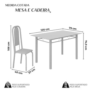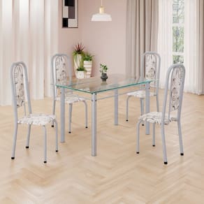 Este conjunto de mesa retangular e 4 cadeiras oferece estilo e praticidade. Com estrutura tubular em aço para estabilidade, o tampo em vidro adiciona sofisticação e resistência a riscos e manchas. As cadeiras combinam harmoniosamente com a mesa, garantindo conforto com estofamento. Ideal para diversos espaços, é perfeito para receber convidados ou desfrutar de refeições em família, criando um ambiente acolhedor e elegante. Medida da Mesa (A x L x P): 74,9 cm x 75 cm x 120 cm Peso da Mesa: 20,18 kg Mesa suporta até: 10 kg Acabamento da Cadeira/Banco: Pintura Texturizada Acabamento da Mesa: Polido Ambiente Principal: Sala de Jantar Cadeira/Banco estofada: Somente Assento Estofado Cadeira/Banco suporta até: 120 kg Complexidade da Montagem: Baixa: pode ser montado por uma pessoa sozinha Cor: Arabesco/ Mart Pérola Cor do Produto: Arabesco/ Mart Pérola Escala de Brilho: Semi-Brilho Espessura do Tampo: 6 mm Estrutura do Assento: Assento em MDP de 15mm c/ couríssimo. Itens Inclusos: 1 Mesa, 4 Cadeiras, Manual de Montagem e Ferragens. Manual de Montagem e Instalação: https://product-hub-prd.madeiramadeira.com.br/917895/documents/6e4e160e-7650-4ebf-827c-2b8630286fc62040633524617181306017506.pdf Material da Base da Mesa: Aço Material da Estrutura da Cadeira: Aço Material do Tampo: Vidro Medida da Cadeira/Banco (A x L x P): 108 cm x 37 cm x 40 cm Medida do Tampo (L x C x E): 75 cm x 120 cm x 0,6 cm Necessita Montagem: Sim Origem do Produto: Nacional Peso da Cadeira/Banco: 3,82 kg Possui Apoio Para os Pés: Não Quantidade de Lugares: 04 Recomendações de Uso, Manutenção e Limpeza: Usar um pano de tecido macio e seco, evitar detergentes, alvejantes e produtos químicos de limpeza; no tampo usar tecido macio levemente umedecido. Sistema de Montagem: Parafusos Vidro Temperado: Sim