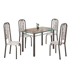 Este conjunto de mesa retangular e 4 cadeiras oferece estilo e praticidade. Com estrutura tubular em aço para estabilidade, o tampo em vidro adiciona sofisticação e resistência a riscos e manchas. As cadeiras combinam harmoniosamente com a mesa, garantindo conforto com estofamento. Ideal para diversos espaços, é perfeito para receber convidados ou desfrutar de refeições em família, criando um ambiente acolhedor e elegante. Medida da Mesa (A x L x P): 74,9 cm x 75 cm x 120 cm Peso da Mesa: 20,18 kg Mesa suporta até: 10 kg Acabamento da Cadeira/Banco: Pintura Texturizada Acabamento da Mesa: Polido Ambiente Principal: Sala de Jantar Cadeira/Banco estofada: Somente Assento Estofado Cadeira/Banco suporta até: 120 kg Complexidade da Montagem: Baixa: pode ser montado por uma pessoa sozinha Cor: Arabesco/ Mart Prata Cor do Produto: Arabesco/ Mart Prata Escala de Brilho: Semi-Brilho Espessura do Tampo: 6 mm Estrutura do Assento: Assento em MDP de 15mm c/ couríssimo. Itens Inclusos: 1 Mesa, 4 Cadeiras, Manual de Montagem e Ferragens. Manual de Montagem e Instalação: https://product-hub-prd.madeiramadeira.com.br/917890/documents/6e59f402-3c9d-479a-b356-c4f04e4fd3642040633524617181306017506.pdf Material da Base da Mesa: Aço Material da Estrutura da Cadeira: Aço Material do Tampo: Vidro Medida da Cadeira/Banco (A x L x P): 108 cm x 37 cm x 40 cm Medida do Tampo (L x C x E): 75 cm x 120 cm x 0,6 cm Necessita Montagem: Sim Origem do Produto: Nacional Peso da Cadeira/Banco: 3,82 kg Possui Apoio Para os Pés: Não Quantidade de Lugares: 04 Recomendações de Uso, Manutenção e Limpeza: Usar um pano de tecido macio e seco, evitar detergentes, alvejantes e produtos químicos de limpeza; no tampo usar tecido macio levemente umedecido. Sistema de Montagem: Parafusos Vidro Temperado: Sim