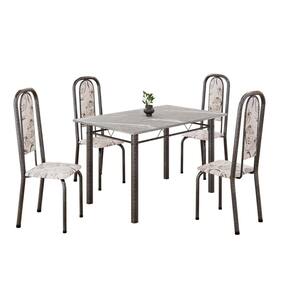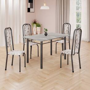 Este conjunto de mesa retangular e 4 cadeiras oferece estilo e praticidade. Com estrutura tubular em aço para estabilidade, o tampo em pedra granito adiciona sofisticação e resistência a riscos e manchas. As cadeiras combinam harmoniosamente com a mesa, garantindo conforto com estofamento. Ideal para diversos espaços, é perfeito para receber convidados ou desfrutar de refeições em família, criando um ambiente acolhedor e elegante. Medida da Mesa (A x L x P): 75,8 cm x 75 cm x 120 cm Peso da Mesa: 55,35 kg Mesa suporta até: 10 kg Acabamento da Cadeira/Banco: Pintura Texturizada Acabamento da Mesa: Polido Ambiente Principal: Sala de Jantar Cadeira/Banco estofada: Somente Assento Estofado Cadeira/Banco suporta até: 120 kg Complexidade da Montagem: Baixa: pode ser montado por uma pessoa sozinha Cor: Arabesco/ Mart Prata Cor do Produto: Arabesco/ Mart Prata Escala de Brilho: Semi-Brilho Espessura do Tampo: 15 mm Estrutura do Assento: Assento em MDP de 15mm c/ couríssimo. Itens Inclusos: 1 Mesa, 4 Cadeiras, Manual de Montagem e Ferragens. Manual de Montagem e Instalação: https://product-hub-prd.madeiramadeira.com.br/917874/documents/560b1def-80da-468c-900e-932d5aecce9d2042077524617181361367918.pdf Material da Base da Mesa: Aço Material da Estrutura da Cadeira: Aço Material do Tampo: Granito Medida da Cadeira/Banco (A x L x P): 108 cm x 37 cm x 40 cm Medida do Tampo (L x C x E): 75 cm x 120 cm x 1,5 cm Necessita Montagem: Sim Origem do Produto: Nacional Peso da Cadeira/Banco: 3,82 kg Possui Apoio Para os Pés: Não Quantidade de Lugares: 04 Recomendações de Uso, Manutenção e Limpeza: Usar um pano de tecido macio e seco, evitar detergentes, alvejantes e produtos químicos de limpeza; no tampo usar tecido macio levemente umedecido. Sistema de Montagem: Parafusos
