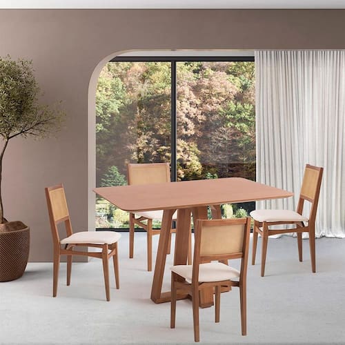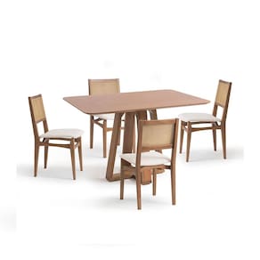 O Conjunto é composto po Mesa Frame com estrutura em madeira maciça jequitibá 25 mm, pés em madeira maciça, acabamento em pintura PU e Cadeira Serena com estrutura em madeira maciça jequitibá 35mm e 15 mm, encosto em fibra natural, enchimento do assento eVendido e entregue por MOBLY COMERCIO VAREJISTA LTDA.