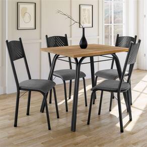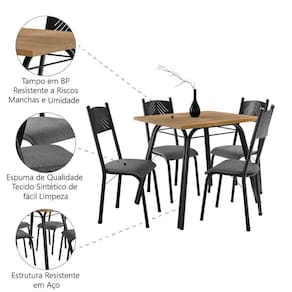 Conjunto De Mesa Sala De Jantar Lotus Com 4 Cadeiras Tampo Retangular Madeirado 91cm Preto/platina Pret/cinza O Conjunto de Mesa Lótus com 4 cadeiras possui design moderno que se adapta a qualquer ambiente. Contém tampo retangular em BP resistente a riscos, manchas e umidade, e as cadeiras são revestidas em tecido sintético de fácil limpeza. Ainda conta com base da mesa e cadeiras em aço, garantindo resistência e durabilidade. MEDIDAS: Medidas da Mesa (Base + Tampo): [ A ] = 76 cm [ L ] = 68 cm [ P ] = 91 cm Medidas da Cadeira: [ A ] = 92 cm [ L ] = 34 cm [ P ] = 41 cm PESO MESA: 14,53 kg (Base + Tampo) PESO CADEIRA: 2,36 kg CADEIRAS SUPORTAM: 120 kg MESA SUPORTA: 40 kg Características MODELO: Conjunto de Mesa Lotus com 4 Cadeiras Liz Preto/Platina Artefamol MARCA: Artefamol COR: Preto/Platina TIPO DE PINTURA: Epóxi ACABAMENTO: Fosco MATERIAL: Base e Cadeira de Aço ESPESSURA DO TAMPO: 5 cm QUANTIDADE DE CADEIRAS: 4 DENSIDADE DA ESPUMA DA CADEIRA: D10 TAMPO MESA: MDP TECIDO CADEIRA: Sintético PÉS: Sapatas de Plástico ITENS INCLUSOS: 1 Base, 1 Tampo e 4 Cadeiras GARANTIA: 3 Meses