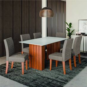 O conjunto de mesa Santiago 1,60m com 6 cadeiras Creta é a escolha perfeita para cozinhas e salas de jantar que buscam conforto e estilo. A mesa conta com tampo em MDF de alta qualidade e base dupla ripada, que proporciona um visual elegante e atual, transformando o ambiente com um toque de modernidade e sofisticação. As cadeiras oferecem assento e encosto acolchoado e revestido com tecido Veluplus de alta qualidade, a cadeira oferece toque macio e durabilidade excepcional. Feita com materiais resistentes e fáceis de limpar, garantindo maior durabilidade e resistência.