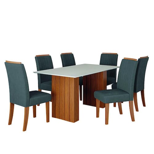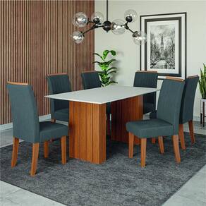 O Conjunto de Mesa Santiago 1,60m com 6 Cadeiras Grécia é a escolha ideal para cozinhas e salas de jantar que valorizam conforto e estilo.A mesa conta com tampo em MDF de alta qualidade e base dupla ripada, que proporciona um visual elegante e atual, transformando o ambiente com um toque de modernidade e sofisticação.A Cadeira Grécia é uma peça de destaque que traz estilo e conforto para o seu espaço. Com assento acolchoado e encosto bordado com espaldar, ela é revestida com tecido Veluplus de alta qualidade, que oferece toque macio e durabilidade excepcional. Feita com materiais resistentes e fáceis de limpar, a cadeira recebe um acabamento com quatro camadas de proteção, garantindo maior durabilidade e resistência.