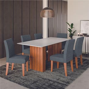 O conjunto de mesa Santiago 1,80m com 6 cadeiras Creta é a escolha perfeita para cozinhas e salas de jantar que buscam conforto e estilo. A mesa conta com tampo em MDF de alta qualidade e base dupla ripada, que proporciona um visual elegante e atual, transformando o ambiente com um toque de modernidade e sofisticação. As cadeiras oferecem assento e encosto acolchoado e revestido com tecido Veluplus de alta qualidade, a cadeira oferece toque macio e durabilidade excepcional. Feita com materiais resistentes e fáceis de limpar, garantindo maior durabilidade e resistência.