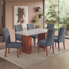O conjunto de mesa Santiago 1,60m com 6 cadeiras Grécia é a escolha perfeita para cozinhas e salas de jantar que buscam conforto e estilo. A mesa possui tampo de vidro temperado colado, e conta com base dupla ripada, que traz um visual moderno e sofisticado ao ambiente. A Cadeira Grécia é uma peça de destaque que traz estilo e conforto para o seu espaço. Com assento acolchoado e encosto bordado com espaldar, ela é revestida com tecido Veluplus de alta qualidade, que oferece toque macio e durabilidade excepcional. Feita com materiais resistentes e fáceis de limpar, a cadeira recebe um acabamento com quatro camadas de proteção, garantindo maior durabilidade e resistência.