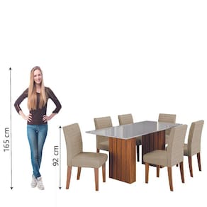 MEDIDAS MESA:: [ A ] = 80 cm [ L ] = 180 cm [ P ] = 90 cm | MEDIDAS CADEIRAS (cada):: [ A ] = 92 cm [ L ] = 42 cm [ P ] = 60 cm | PESO MESA:: 66,80 Kg | PESO CADEIRA:: 7,25 Kg (cada) | PESO SUPORTADO MESA:: 20 Kg (distribuídos) | PESO SUPORTADO CADEIRA:: 110 Kg cada | MODELO:: Conjunto de Mesa Sala de Jantar Ripada Tampo com Vidro Santiago 1,80m 6 Cadeiras Creta | MARCA:: Dobuê | ACABAMENTO MESA:: Pintura UV | ESTRUTURA:: MDF | ACABAMENTO CADEIRA:: Veluplus | TECIDO DA CADEIRA:: Veluplus | REVESTIMENTO ASSENTO E ENCOSTO DA CADEIRA:: Espuma D20 | MATERIAL DO TAMPO:: MDF | TAMPO COM VIDRO:: Sim | PÉS DA CADEIRA:: Sapatas Plásticas | DIFERENCIAL:: Material em MDF de alta resistência, tampo com vidro e base ripada, cadeiras com assento e encosto acolchoados, tecido veluplus. | SISTEMA DE MONTAGEM:: Parafusos e porcas cilíndricas | ITENS INCLUSOS:: 1 Mesa e 6 cadeiras, 1 manual de montagem e 1 kit parafusos | INSTRUÇÕES E CUIDADOS:: Limpar com pano levemente umedecido com água, não utilizar produtos abrasivos | GARANTIA:: 3 meses pelo fabricante | AVISO:: A Esplanada Móveis se responsabiliza pela dos produtos adquiridos até a porta de entrada ou portaria do indicado, se a portaria do condomínio permitir, as são efetuadas no piso térreo e é de responsabilidade do cliente. | Altura: 80 | Ambiente recomendado: sala de jantar | Forma: retangular | Inclui manual de montagem: sim | Material da tampa: mdf | Quantidade de caixas de embalagem: 8 | Requer montagem: sim | Cor: Madeirado / Bege