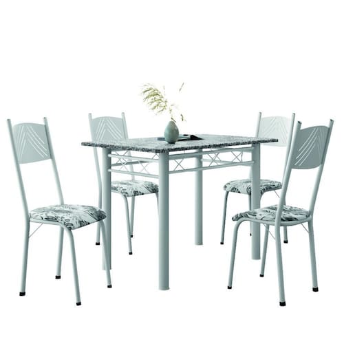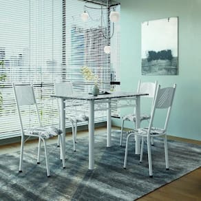 O Conjunto de Mesa Sara com 4 Cadeiras foi desenvolvido para trazer ainda mais beleza, conforto e praticidade ao seu lar. A mesa possui tampo retangular em granito natural, material nobre e resistente a altas temperaturas, perfeito para apoiar panelas e travessas sem preocupação. Seu design combina elegância e funcionalidade, tornando o ambiente mais sofisticado. As cadeiras são estofadas com tecido sintético de fácil limpeza, unindo conforto no sentar com a praticidade do dia a dia. O acabamento proporciona toque macio e visual moderno, adaptando-se facilmente a diferentes estilos de decoração. A estrutura da mesa e das cadeiras é feita em aço de alta qualidade, garantindo estabilidade, resistência e longa durabilidade.