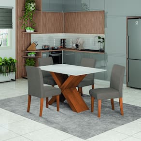 O Conjunto de Mesa Grécia com 4 cadeiras Trieste é perfeito para compor sua cozinha ou Sala de Jantar. A mesa possui base com design moderno, e tampo em MDF com vidro temperado, que forma uma camada transparente de alta resistência que garante mais qualidade além de deixar seu ambiente mais sofisticado. Já as cadeiras, com estrutura em MDF e revestimento em tecido Veluplus, oferecem um toque suave e aconchegante. Os assentos e encostos são acolchoados com espuma de alta qualidade, proporcionando máximo conforto.