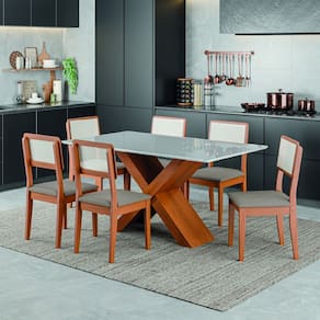 O Conjunto de Mesa Grécia com 6 cadeiras Santiago é perfeito para compor sua cozinha ou Sala de Jantar. A mesa possui base com design moderno, e tampo em MDF com vidro temperado, que forma uma camada transparente de alta resistência que garante mais qualidade além de deixar seu ambiente mais sofisticado. As cadeiras oferecem assento acolchoado e encosto em tela, proporcionando conforto e estilo. Feito com materiais resistentes e fáceis de limpar, este conjunto é perfeito para quem busca estilo, conforto e praticidade em um único produto.