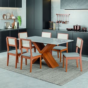 O Conjunto de Mesa Grécia com 6 cadeiras Santiago é perfeito para compor sua cozinha ou Sala de Jantar. A mesa possui base com design moderno, e tampo em MDF com vidro temperado, que forma uma camada transparente de alta resistência que garante mais qualidade além de deixar seu ambiente mais sofisticado. As cadeiras oferecem assento acolchoado e encosto em tela, proporcionando conforto e estilo. Feito com materiais resistentes e fáceis de limpar, este conjunto é perfeito para quem busca estilo, conforto e praticidade em um único produto.