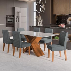 O Conjunto de Mesa Grécia com 6 cadeiras Creta é perfeito para compor sua cozinha ou Sala de Jantar. A mesa possui base com design moderno, e tampo em MDF com vidro temperado, que forma uma camada transparente de alta resistência que garante mais qualidade além de deixar seu ambiente mais sofisticado. As cadeiras oferecem assento e encosto acolchoado e revestido com tecido Veluplus de alta qualidade, a cadeira oferece toque macio e durabilidade excepcional. Feita com materiais resistentes e fáceis de limpar, garantindo maior durabilidade e resistência.