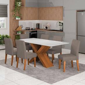 O Conjunto de Mesa Grécia com 6 cadeiras Trieste é perfeito para compor sua cozinha ou Sala de Jantar. A mesa possui base com design moderno, e tampo em MDF com vidro temperado, que forma uma camada transparente de alta resistência que garante mais qualidade além de deixar seu ambiente mais sofisticado. Já as cadeiras, com estrutura em MDF e revestimento em tecido Veluplus, oferecem um toque suave e aconchegante. Os assentos e encostos são acolchoados com espuma de alta qualidade, proporcionando máximo conforto.