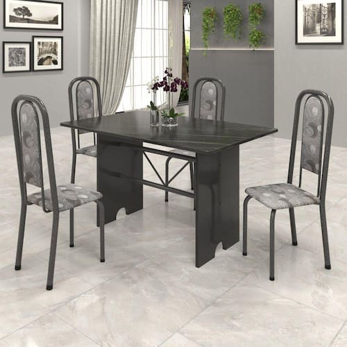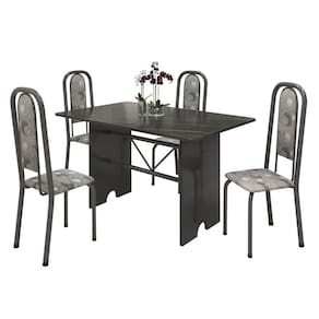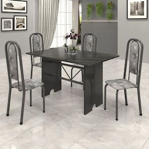 Quer deixar sua casa completa com um toque especial? Uma dica bacana de como transformar sua cozinha, deixando-a mais receptiva e bonita? Então você precisa de móveis indispensáveis para deixar seu lar muito mais aconchegante, receptivo e sempre disponível para receber a visita de amigos, familiares e convidados. Você vai se apaixonar por este incrível Conjunto de Mesa com 4 Cadeiras Lavínea. Ideal para cozinha, ele é a marromhor opção para completar o espaço. Aproveite!! Acabamento da Cadeira/Banco: Pintura Texturizada Acabamento da Mesa: Acetinado Almofada do assento: Fixa Ambiente Principal: Cozinha Cadeira/Banco estofada: Sim Cadeira/Banco suporta até: 120 kg Complexidade da Montagem: Baixa: pode ser montado por uma pessoa sozinha Cor: Martelado Prata/ Ardosia Indiano/ Paraopeba Cor do Produto: Martelado Prata/ Ardosia Indiano/ Paraopeba Enchimento do Assento: Espuma D-16 Escala de Brilho: Semi-Brilho Espessura do Tampo: 15 mm Estrutura do Assento: MDP 15mm Itens Inclusos: 1 Mesa, 4 Cadeiras, Kit Ferragens e Manual de Montagem Linha ou Coleção: LAVÍNEA Manual de Especificação Técnica: https://cdn2.madeiramadeira.com.br/atributo/soma-moveis-ltda/1150195-manual-de-montagem-cad-lavInea-rev-0-0.pdf Manual de Montagem e Instalação: https://cdn2.madeiramadeira.com.br/atributo/soma-moveis-ltda/1150194-manual-de-montagem-base-070-e-071-rev-1-0.pdf Material da Base da Mesa: Granito Material da Estrutura da Cadeira: Aço Medida da Cadeira/Banco (A x L x P): 108X37X40 Medida da Mesa (A x L x P): 75x75x120cm Medida do Tampo (L x C x E): 120x75x1,5cm Mesa suporta até: 10 kg Necessita Montagem: Sim Origem do Produto: Nacional Peso da Cadeira/Banco: 3,82 kg Peso da Mesa: 65,72 kg Possui Apoio para Braços: Não Possui Apoio Para os Pés: Não Possui Suporte Giratório: Não Recomendações de Uso, Manutenção e Limpeza: Não permitir que molhe os pés da base, usar um pano de tecido macio e seco, evitar detergentes, alvejantes e produtos químicos de limpeza; no tampo usar tecido macio levemente umedecido. Revestimento da Cadeira/Banco: Couro Ecológico Sistema de Montagem: PARAFUSOS