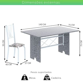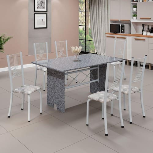 Quer deixar sua casa completa? Uma dica bacana de como transformar o seu lar, deixando-o mais receptivo e bonito? Então você precisa de móveis indispensáveis e deixar seu lar muito mais aconchegante, receptivo e sempre disponível para receber a visita de amigos, familiares e convidados. Você vai se apaixonar por este incrível Conjunto de Mesa com 6 Cadeiras Lorena. Ideal para cozinha, ele é a melhor opção para completar o espaço. Aproveite!! Medida da Mesa (A x L x P): 75 cm x 75 cm x 140 cm Peso da Mesa: 80,7 kg Mesa suporta até: 10.0000 Acabamento da Cadeira/Banco: Pintura Texturizada Acabamento da Mesa: Pintura Texturizada Ambiente Principal: Cozinha Cadeira/Banco estofada: Somente Assento Estofado Cadeira/Banco Estofada: Somente Assento Estofado Cadeira/Banco suporta até: 120.0000 codigo_ean: 7909903495483 Complexidade da Montagem: Baixa: pode ser montado por uma pessoa sozinha Cor: Paraopeba/Branco Cor do Produto: Paraopeba/Branco Escala de Brilho: Semi-Brilho Espessura do Tampo: 20 mm Itens Inclusos: 1 Mesa, 6 Cadeiras, Manual de Montagem e Kit Ferragens. Linha ou Coleção: Lorena Manual de Montagem e Instalação: https://product-hub-prd.madeiramadeira.com.br/880727/documents/2d71b3ff-d8dd-4c13-bbe7-c04a5637f22fnualdemontagemcadeiraemesa.pdf Material da Base da Mesa: Granito Material da Estrutura da Cadeira: Aço Material do Tampo: Granito Medida da Base (A x L x P): 74 cm x 45 cm x 86 cm Medida da Cadeira/Banco (A x L x P): 98 cm x 40 cm x 37 cm Medida do Tampo (L x C x E): 75 cm x 140 cm x 2,0 cm Necessita Montagem: Sim Origem do Produto: Nacional Peso da Cadeira/Banco: 3,48 kg Possui Apoio Para os Pés: Não Quantidade de Cadeiras: 6 Quantidade de Lugares: 06 Recomendações de Uso, Manutenção e Limpeza: Usar um pano de tecido macio e seco, evitar detergentes, alvejantes e produtos químicos de limpeza; no tampo usar tecido macio levemente umedecido. Sistema de Montagem: Parafusos
