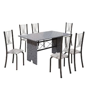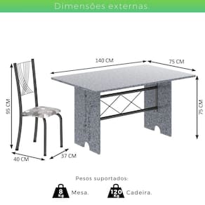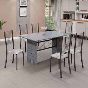 Quer deixar sua casa completa? Uma dica bacana de como transformar o seu lar, deixando-o mais receptivo e bonito? Então você precisa de móveis indispensáveis e deixar seu lar muito mais aconchegante, receptivo e sempre disponível para receber a visita de amigos, familiares e convidados. Você vai se apaixonar por este incrível Conjunto de Mesa com 6 Cadeiras Lorena. Ideal para cozinha, ele é a melhor opção para completar o espaço. Aproveite!! Medida da Mesa (A x L x P): 75 cm x 75 cm x 140 cm Peso da Mesa: 80,7 kg Mesa suporta até: 10.0000 Acabamento da Cadeira/Banco: Pintura Texturizada Acabamento da Mesa: Pintura Texturizada Ambiente Principal: Cozinha Cadeira/Banco estofada: Somente Assento Estofado Cadeira/Banco Estofada: Somente Assento Estofado Cadeira/Banco suporta até: 120.0000 codigo_ean: 7909903493984 Complexidade da Montagem: Baixa: pode ser montado por uma pessoa sozinha Cor: Paraopeba/Mart Prata Cor do Produto: Paraopeba/Mart Prata Escala de Brilho: Semi-Brilho Espessura do Tampo: 20 mm Itens Inclusos: 1 Mesa, 6 Cadeiras, Manual de Montagem e Kit Ferragens. Linha ou Coleção: Lorena Manual de Montagem e Instalação: https://product-hub-prd.madeiramadeira.com.br/880718/documents/c1b74947-2289-41c1-b507-c3868a4cdf20nualdemontagemcadeiraemesa.pdf Material da Base da Mesa: Granito Material da Estrutura da Cadeira: Aço Material do Tampo: Granito Medida da Base (A x L x P): 74 cm x 45 cm x 86 cm Medida da Cadeira/Banco (A x L x P): 98 cm x 40 cm x 37 cm Medida do Tampo (L x C x E): 75 cm x 140 cm x 2,0 cm Necessita Montagem: Sim Origem do Produto: Nacional Peso da Cadeira/Banco: 3,48 kg Possui Apoio Para os Pés: Não Quantidade de Cadeiras: 6 Quantidade de Lugares: 06 Recomendações de Uso, Manutenção e Limpeza: Usar um pano de tecido macio e seco, evitar detergentes, alvejantes e produtos químicos de limpeza; no tampo usar tecido macio levemente umedecido. Sistema de Montagem: Parafusos