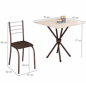 Largura Mesa: 70 cmAltura Mesa: 77 cmProfundidade Mesa: 70 cmPeso: 11,60 KgLargura Cadeira: 37 cmAltura Cadeira: 85 cmProfundidade Cadeira: 42 cmPeso: 2,48 Kg cadaGarantia: 03 MesesInformações Sobre Montagem: Não possuímos serviço de montagem.