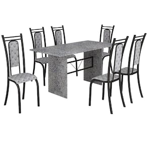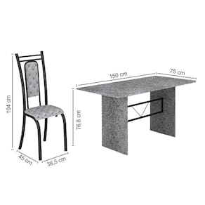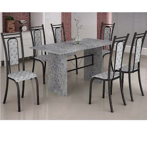 Estrutura : : : : : Aço Acabamento: : : : : Pintura Eletrostática.Escala de brilho: : : : : Brilhante.Cadeiras : : : : : Estrutura em aço de 1 1/4?, assento Fixo de compensado 9 mm com camada de espuma D16 de 12 mm e porca garra, revestimento em tecido sintético, suporta até 130 Kilos.Encosto: : : : : Fixo, de MDP 15 mm com camada de espuma D16 de 12 mm, revestimento em tecido sintético.Tampo: : : : : Granito, com espessura de 18 mm, suporta até 30 Kilos. Dimensões do produto: : : : : Mesa: : : : : Largura: : : : : 75,0 cmAltura: : : : : 76,8 cmProfundidade: : : : : 150,0 cmPeso: : : : : 92,63 KgCadeira: : : : : Largura: : : : : 38,50 cmAltura: : : : : 104,0 cmProfundidade: : : : : 45,0 cmPeso: : : : : 4,28 Kg cada Garantia: : : : : 03 MesesInformações Sobre Montagem: : : : : Não possuímos serviço de montagem.