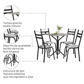 O Conjunto de Mesa Thais com 4 lugares foi desenvolvido para trazer ainda mais beleza e conforto para o seu lar. Possui tampo quadrado em granito resistente a altas temperaturas, e as cadeiras são revestidas de fácil limpeza. Ainda conta com base da mesa e cadeiras de aço, garantindo resistência e durabilidade.