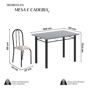 Quer deixar sua casa completa e prática? Uma dica bacana de como transformar o seu lar, deixando-o mais receptivo e bonito? Então você precisa de móveis indispensáveis para deixar seu lar muito mais aconchegante, receptivo e sempre disponível para receber a visita de amigos, familiares e convidados. Você vai se apaixonar por este incrível e moderno Conjunto de Mesa com 4 Cadeiras ANE B. Ideal para cozinha, ele é a melhor opção para completar o espaço que você desejar. Aproveite!! Medida da Mesa (A x L x P): 75,8 cm x 100 cm x 60 cm Peso da Mesa: 41,54 kg Mesa suporta até: 10.0000 Acabamento da Cadeira/Banco: Pintura Texturizada Acabamento da Mesa: Pintura Texturizada Ambiente Principal: Cozinha Cadeira/Banco estofada: Somente Assento Estofado Cadeira/Banco Estofada: Somente Assento Estofado Cadeira/Banco suporta até: 120.0000 codigo_ean: 7900288049285 Complexidade da Montagem: Baixa: pode ser montado por uma pessoa sozinha Cor: Arabesco / Preto Cor do Produto: Arabesco / Preto Cor Secundária: Bege De Canto (Canto Alemão): Não Escala de Brilho: Semi-Brilho Espessura do Tampo: 1,5 mm Estrutura do Assento: MDP Formato do Tampo: Retangular Itens Inclusos: 1 Mesa, 4 Cadeiras, 1 Kit Ferragens e 1 Manual de Montagem Linha ou Coleção: Ane B Manual de Montagem e Instalação: https://product-hub-prd.madeiramadeira.com.br/975535/documents/a92196e8-bbbb-45ff-857c-dc0fe1ea7a2b2645257352817375705415518.pdf Marca: Soma Móveis Material da Base da Mesa: Aço Material da Estrutura da Cadeira: Aço Material do Tampo: Granito Medida da Cadeira/Banco (A x L x P): 89 cm x 37 cm x 42 cm Medida do Tampo (L x C x E): 60 cm x 100 cm x 1,5 cm Mesa Extensível: Não Necessita Montagem: Sim Origem do Produto: Nacional Peso da Cadeira/Banco: 3 kg Possui Apoio Para os Pés: Não Quantidade de Cadeiras: 4 Quantidade de Lugares: 04 Recomendações de Uso, Manutenção e Limpeza: Não permitir que molhe os pés da base, usar um pano de tecido macio e seco, evitar detergentes, alvejantes e produtos químicos de limpeza; no tampo usar tecido macio levemente umedecido. Sistema de Montagem: Parafusos