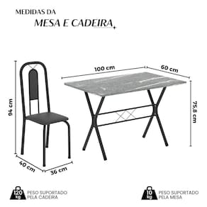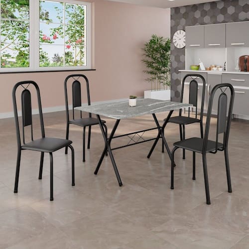 Quer deixar sua casa completa e prática? Uma dica bacana de como transformar o seu lar, deixando-o mais receptivo e bonito? Então você precisa de móveis indispensáveis para deixar seu lar muito mais aconchegante, receptivo e sempre disponível para receber a visita de amigos, familiares e convidados. Você vai se apaixonar por este incrível e moderno Conjunto de Mesa com 4 Cadeiras. Ideal para cozinha, ele é a melhor opção para completar o espaço que você desejar. Aproveite!! Medida da Mesa (A x L x P): 75,8 cm x 100 cm x 60 cm Peso da Mesa: 39,82 kg Mesa suporta até: 10.0000 Acabamento da Cadeira/Banco: Pintura Texturizada Acabamento da Mesa: Pintura Texturizada Ambiente Principal: Cozinha Cadeira/Banco Estofada: Somente Assento Estofado Cadeira/Banco estofada: Somente Assento Estofado Cadeira/Banco suporta até: 120.0000 codigo_ean: 7900288128584 Complexidade da Montagem: Baixa: pode ser montado por uma pessoa sozinha Cor: Preto Cor do Produto: Preto Cor Secundária: Cinza De Canto (Canto Alemão): Não Escala de Brilho: Semi-Brilho Espessura do Tampo: 1,5 mm Estrutura do Assento: MDP Formato do Tampo: Retangular Itens Inclusos: 1 Mesa, 4 Cadeiras, Kit Ferragens e Manual de Montagem Linha ou Coleção: Lívia Manual de Montagem e Instalação: https://product-hub-prd.madeiramadeira.com.br/634066544/documents/8265dca6-e9c9-4a45-a0e5-2b13344d6af872716723352817406057034671.pdf Marca: Soma Móveis Material da Base da Mesa: Aço Material da Estrutura da Cadeira: Aço Material do Tampo: Granito Medida da Cadeira/Banco (A x L x P): 94 cm x 36 cm x 40 cm Medida do Tampo (L x C x E): 100cm x 60cm x 1,5 cm Mesa Extensível: Não Necessita Montagem: Sim Origem do Produto: Nacional Peso da Cadeira/Banco: 2,28 kg Possui Apoio Para os Pés: Não Quantidade de Cadeiras: 4 Quantidade de Lugares: 04 Recomendações de Uso, Manutenção e Limpeza: Não permitir que molhe os pés da base, usar um pano de tecido macio e seco, evitar detergentes, alvejantes e produtos químicos de limpeza; no tampo usar tecido macio levemente umedecido. Sistema de Montagem: Parafusos