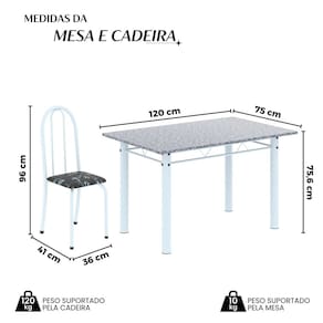 Quer deixar sua casa completa e prática? Uma dica bacana de como transformar o seu lar, deixando-o mais receptivo e bonito? Então você precisa de móveis indispensáveis para deixar seu lar muito mais aconchegante, receptivo e sempre disponível para receber a visita de amigos, familiares e convidados. Você vai se apaixonar por este incrível e moderno Conjunto de Mesa com 4 Cadeiras. Ideal para cozinha, ele é a melhor opção para completar o espaço que você desejar. Aproveite!! Medida da Mesa (A x L x P): 75,6 cm x 120 cm x 75cm Peso da Mesa: 51,12 kg Mesa suporta até: 10.0000 Acabamento da Cadeira/Banco: Pintura Texturizada Acabamento da Mesa: Pintura Texturizada Ambiente Principal: Sala de Jantar Cadeira/Banco estofada: Somente Assento Estofado Cadeira/Banco Estofada: Somente Assento Estofado Cadeira/Banco suporta até: 120.0000 codigo_ean: 7900288056702 Complexidade da Montagem: Baixa: pode ser montado por uma pessoa sozinha Cor: Preto / Branco Cor do Produto: Preto / Branco Cor Secundária: Cinza De Canto (Canto Alemão): Não Escala de Brilho: Brilhante Espessura do Tampo: 1,5 mm Estrutura do Assento: MDP Formato do Tampo: Retangular Itens Inclusos: 1 Mesa, 4 Cadeiras, 1 Kit Ferragens + Manual de Montagem Linha ou Coleção: Iris B Manual de Montagem e Instalação: https://product-hub-prd.madeiramadeira.com.br/976116/documents/a5eeaba6-cc0a-4e56-a4c3-4426b82067832653848352817381021070967.pdf Marca: Soma Móveis Material da Base da Mesa: Aço Material da Estrutura da Cadeira: Aço Material do Tampo: Granito Medida da Cadeira/Banco (A x L x P): 96 cm x 36 cm x 41 cm Medida do Tampo (L x C x E): 75 cm x 120 cm x 1,5 cm Mesa Extensível: Não Necessita Montagem: Sim Origem do Produto: Nacional Peso da Cadeira/Banco: 3,88 kg Possui Apoio Para os Pés: Não Possui Suporte Giratório: Não Quantidade de Cadeiras: 4 Quantidade de Lugares: 04 Recomendações de Uso, Manutenção e Limpeza: Não permitir que molhe os pés da base, usar um pano de tecido macio e seco, evitar detergentes, alvejantes e produtos químicos de limpeza; no tampo usar tecido macio levemente umedecido. Sistema de Montagem: Parafusos
