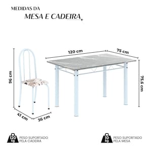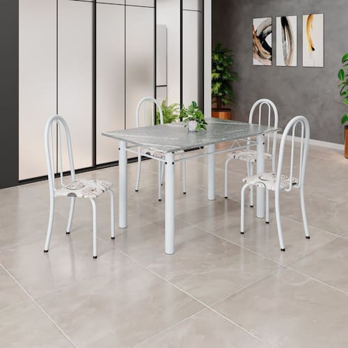Quer deixar sua casa completa e prática? Uma dica bacana de como transformar o seu lar, deixando-o mais receptivo e bonito? Então você precisa de móveis indispensáveis para deixar seu lar muito mais aconchegante, receptivo e sempre disponível para receber a visita de amigos, familiares e convidados. Você vai se apaixonar por este incrível e moderno Conjunto de Mesa com 4 Cadeiras. Ideal para cozinha, ele é a melhor opção para completar o espaço que você desejar. Aproveite!! Medida da Mesa (A x L x P): 75,6 cm x 120 cm x 75cm Peso da Mesa: 61,28 kg Mesa suporta até: 10.0000 Acabamento da Cadeira/Banco: Pintura Texturizada Acabamento da Mesa: Pintura Texturizada Ambiente Principal: Sala de Jantar Cadeira/Banco Estofada: Somente Assento Estofado Cadeira/Banco estofada: Somente Assento Estofado Cadeira/Banco suporta até: 120.0000 codigo_ean: 7900288061645 Complexidade da Montagem: Baixa: pode ser montado por uma pessoa sozinha Cor: Arabesco/ Branco Cor do Produto: Arabesco/ Branco Cor Secundária: Bege De Canto (Canto Alemão): Não Escala de Brilho: Brilhante Espessura do Tampo: 1,5 mm Estrutura do Assento: MDP Formato do Tampo: Retangular Itens Inclusos: 1 Mesa, 4 Cadeiras, 1 Kit Ferragens + 1 Manual de Montagem Linha ou Coleção: Iris B Manual de Montagem e Instalação: https://product-hub-prd.madeiramadeira.com.br/976094/documents/a289866f-ce85-436f-9434-7952b5aa9f232653848352817381021070967.pdf Marca: Soma Móveis Material da Base da Mesa: Aço Material da Estrutura da Cadeira: Aço Material do Tampo: Granito Medida da Cadeira/Banco (A x L x P): 96 cm x 36 cm x 41 cm Medida do Tampo (L x C x E): 75 cm x 120 cm x 1,5 cm Mesa Extensível: Não Necessita Montagem: Sim Origem do Produto: Nacional Peso da Cadeira/Banco: 3,88 kg Possui Apoio Para os Pés: Não Possui Suporte Giratório: Não Quantidade de Cadeiras: 4 Quantidade de Lugares: 04 Recomendações de Uso, Manutenção e Limpeza: Não permitir que molhe os pés da base, usar um pano de tecido macio e seco, evitar detergentes, alvejantes e produtos químicos de limpeza; no tampo usar tecido macio levemente umedecido. Sistema de Montagem: Parafusos