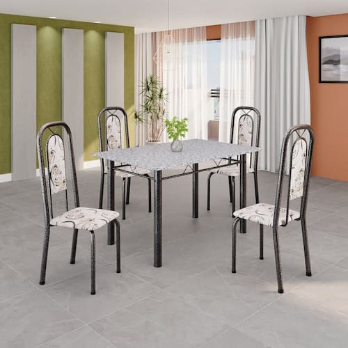 Quer deixar sua casa completa e prática? Uma dica bacana de como transformar o seu lar, deixando-o mais receptivo e bonito? Então você precisa de móveis indispensáveis para deixar seu lar muito mais aconchegante, receptivo e sempre disponível para receber a visita de amigos, familiares e convidados. Você vai se apaixonar por este incrível e moderno Conjunto de Mesa com 4 Cadeiras. Ideal para cozinha, ele é a melhor opção para completar o espaço que você desejar. Aproveite!! Medida da Mesa (A x L x P): 75 cm x 120 cm x 75 cm Peso da Mesa: 57,08 kg Mesa suporta até: 8 kg Acabamento da Cadeira/Banco: Pintura Texturizada Acabamento da Mesa: Pintura Texturizada Ambiente Principal: Cozinha Cadeira/Banco estofada: Encosto e Assento Estofados Cadeira/Banco suporta até: 120 kg codigo_ean: 7900288140203 Complexidade da Montagem: Baixa: pode ser montado por uma pessoa sozinha Cor: Arabesco / Mart Prata Cor do Produto: Arabesco / Mart Prata Cor Secundária: Bege De Canto (Canto Alemão): Não Enchimento do Assento: Espuma D-16 Escala de Brilho: Brilhante Espessura do Tampo: 1,5 mm Estrutura do Assento: MDP Formato do Tampo: Retangular Itens Inclusos: 1 Mesa, 4 Cadeiras, Kit Ferragens e Manual de Montagem Linha ou Coleção: Lara Manual de Montagem e Instalação: https://product-hub-prd.madeiramadeira.com.br/992342/documents/9080a880-0d85-4ed9-8a26-6afa84b3053e2818001352817441405246925.pdf Marca: Soma Móveis Material da Base da Mesa: Aço Material da Estrutura da Cadeira: Aço Material do Tampo: Granito Medida da Cadeira/Banco (A x L x P): 105 cm x 37 cm x 40 cm Medida do Tampo (L x C x E): 120cm x 75cm x 1,5 cm Mesa Extensível: Não Necessita Montagem: Sim Origem do Produto: Nacional Peso da Cadeira/Banco: 2,7 kg Possui Apoio Para os Pés: Não Quantidade de Cadeiras: 4 Quantidade de Lugares: 04 Recomendações de Uso, Manutenção e Limpeza: Não permitir que molhe os pés da base, usar um pano de tecido macio e seco, evitar detergentes, alvejantes e produtos químicos de limpeza; no tampo usar tecido macio levemente umedecido. Revestimento da Cadeira/Banco: Couro Ecológico Sistema de Montagem: Parafusos