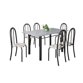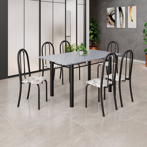 você desejar. Aproveite!! Medida da Mesa (A x L x P): 75,6 cm x 140 cm x 75cm Peso da Mesa: 66,1 kg Mesa suporta até: 10.0000 Acabamento da Cadeira/Banco: Pintura Texturizada Acabamento da Mesa: Pintura Texturizada Ambiente Principal: Sala de Jantar Cadeira/Banco estofada: Somente Assento Estofado Cadeira/Banco Estofada: Somente Assento Estofado Cadeira/Banco suporta até: 120.0000 codigo_ean: 7900288062710 Complexidade da Montagem: Baixa: pode ser montado por uma pessoa sozinha Cor: Arabesco / Preto Cor do Produto: Arabesco / Preto Cor Secundária: Cinza De Canto (Canto Alemão): Não Escala de Brilho: Semi-Brilho Espessura do Tampo: 1,5 mm Estrutura do Assento: MDP Formato do Tampo: Retangular Itens Inclusos: 1 Mesa + 6 Cadeiras + 1 Kit Ferragens + Manual de Montagem Linha ou Coleção: Iris B Manual de Montagem e Instalação: https://product-hub-prd.madeiramadeira.com.br/976413/documents/4c81499f-62a5-4b2f-8d10-25c78f04d5492653848352817381021070967.pdf Marca: Soma Móveis Material da Base da Mesa: Aço Material da Estrutura da Cadeira: Aço Material do Tampo: Granito Medida da Base (A x L x P): 75cm x 63,5 cm x 108 cm Medida da Cadeira/Banco (A x L x P): 96 cm x 36 cm x 41 cm Medida do Tampo (L x C x E): 75 cm x 140 cm x 1,5 cm Mesa Extensível: Não Necessita Montagem: Sim Origem do Produto: Nacional Peso da Cadeira/Banco: 3,88 kg Possui Apoio Para os Pés: Não Possui Suporte Giratório: Não Quantidade de Cadeiras: 6 Quantidade de Lugares: 06 Recomendações de Uso, Manutenção e Limpeza: Não permitir que molhe os pés da base, usar um pano de tecido macio e seco, evitar detergentes, alvejantes e produtos químicos de limpeza; no tampo usar tecido macio levemente umedecido. Sistema de Montagem: Parafusos