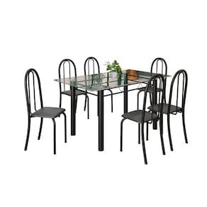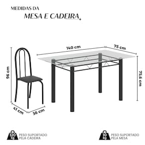 completar o espaço que você desejar. Aproveite!! Medida da Mesa (A x L x P): 75,6 cm x 140 cm x 75cm Peso da Mesa: 22,26 kg Mesa suporta até: 10.0000 Acabamento da Cadeira/Banco: Pintura Texturizada Acabamento da Mesa: Pintura Texturizada Ambiente Principal: Sala de Jantar Cadeira/Banco estofada: Somente Assento Estofado Cadeira/Banco Estofada: Somente Assento Estofado Cadeira/Banco suporta até: 120.0000 codigo_ean: 7900288062949 Complexidade da Montagem: Baixa: pode ser montado por uma pessoa sozinha Cor: Preto / Preto Cor do Produto: Preto / Preto Cor Secundária: Cinza De Canto (Canto Alemão): Não Escala de Brilho: Semi-Brilho Espessura do Tampo: 6 mm Espessura do Vidro: 6 mm Estrutura do Assento: MDP Formato do Tampo: Retangular Itens Inclusos: 1 Mesa + 6 Cadeiras + 1 Kit Ferragens + Manual de Montagem Linha ou Coleção: Iris B Manual de Montagem e Instalação: https://product-hub-prd.madeiramadeira.com.br/976437/documents/201d160e-b395-4fc6-add0-f8ea1271d0f42653848352817381021070967.pdf Marca: Soma Móveis Material da Base da Mesa: Aço Material da Estrutura da Cadeira: Aço Material do Tampo: Vidro Medida da Base (A x L x P): 75cm x 63,5 cm x 108 cm Medida da Cadeira/Banco (A x L x P): 96 cm x 36 cm x 41 cm Medida do Tampo (L x C x E): 75 cm x 140 cm x 0,6 cm Mesa Extensível: Não Necessita Montagem: Sim Origem do Produto: Nacional Peso da Cadeira/Banco: 3,88 kg Possui Apoio Para os Pés: Não Possui Suporte Giratório: Não Quantidade de Cadeiras: 6 Quantidade de Lugares: 06 Recomendações de Uso, Manutenção e Limpeza: Não permitir que molhe os pés da base, usar um pano de tecido macio e seco, evitar detergentes, alvejantes e produtos químicos de limpeza; no tampo usar tecido macio levemente umedecido. Sistema de Montagem: Parafusos Vidro Temperado: Sim