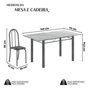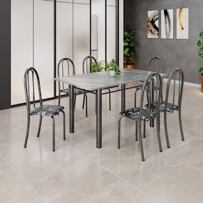 você desejar. Aproveite!! Medida da Mesa (A x L x P): 75,6 cm x 140 cm x 75cm Peso da Mesa: 69,4 kg Mesa suporta até: 10.0000 Acabamento da Cadeira/Banco: Pintura Texturizada Acabamento da Mesa: Pintura Texturizada Ambiente Principal: Sala de Jantar Cadeira/Banco estofada: Somente Assento Estofado Cadeira/Banco Estofada: Somente Assento Estofado Cadeira/Banco suporta até: 120.0000 codigo_ean: 7900288061577 Complexidade da Montagem: Baixa: pode ser montado por uma pessoa sozinha Cor: Preto Floral / Mart Prata Cor do Produto: Preto Floral / Mart Prata Cor Secundária: Cinza De Canto (Canto Alemão): Não Escala de Brilho: Brilhante Espessura do Tampo: 1,5 mm Estrutura do Assento: MDP Formato do Tampo: Retangular Itens Inclusos: 1 Mesa + 6 Cadeiras + 1 Kit Ferragens + Manual de Montagem Linha ou Coleção: Iris B Manual de Montagem e Instalação: https://product-hub-prd.madeiramadeira.com.br/976029/documents/89b0dcff-a27c-4a72-a756-86c6aeddb9742653848352817381021070967.pdf Marca: Soma Móveis Material da Base da Mesa: Aço Material da Estrutura da Cadeira: Aço Material do Tampo: Granito Medida da Base (A x L x P): 75cm x 63,5 cm x 108 cm Medida da Cadeira/Banco (A x L x P): 96 cm x 36 cm x 41 cm Medida do Tampo (L x C x E): 75 cm x 140 cm x 1,5 cm Mesa Extensível: Não Necessita Montagem: Sim Origem do Produto: Nacional Peso da Cadeira/Banco: 3,88 kg Possui Apoio Para os Pés: Não Possui Suporte Giratório: Não Quantidade de Cadeiras: 6 Quantidade de Lugares: 06 Recomendações de Uso, Manutenção e Limpeza: Não permitir que molhe os pés da base, usar um pano de tecido macio e seco, evitar detergentes, alvejantes e produtos químicos de limpeza; no tampo usar tecido macio levemente umedecido. Sistema de Montagem: Parafusos