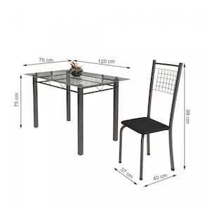 Quer deixar sua casa completa? Uma dica bacana de como transformar o seu lar, deixando-o mais receptivo e bonito? Então você precisa de móveis indispensáveis e deixar seu lar muito mais aconchegante, receptivo e sempre disponível para receber a visita de amigos, familiares e convidados. Você vai se apaixonar por este incrível Conjunto de Mesa com 4 Cadeiras IZA. Ideal para cozinha, ele é a melhor opção para completar o espaço. Aproveite!! Acabamento da Cadeira/Banco: Pintura Texturizada Acabamento da Mesa: Pintura Texturizada Almofada do assento: Fixa Altura do Conjunto: Ambiente Principal: Cozinha Apoio para Braços Estofado: Cadeira/Banco estofada: Sim Cadeira/Banco suporta até: 120 Complexidade da Montagem: Média: pode ser montado por mais de uma pessoa e/ou necessite de maior conhecimento para montagem Cor: Preto/Prata Cor do Produto: Preto/Prata Enchimento do Assento: Espuma D-16 Enchimento do Encosto: Espuma D-16 Escala de Brilho: Fosco Espessura do Tampo: 6 Estrutura do Assento: Assento em MDP de 15mm c/ couríssimo. Estrutura do Encosto: MDP de 15mm c/ courissimo Informações Complementares: Itens Inclusos: 1 Mesa, 4 Cadeiras, Kit Ferragens e Manual de Montagem Linha ou Coleção: Iza Manual de Especificação Técnica: https://cdn2.madeiramadeira.com.br/atributo/soma-m-veis/892206-manual-de-montagem-cad-iza-rev-0-0.pdf Manual de Montagem e Instalação: https://cdn2.madeiramadeira.com.br/atributo/soma-m-veis/892107-manual-de-montagem-base-013.pdf Material da Base da Mesa: Aço Material da Estrutura da Cadeira: Aço Medida da Base (A x L x P): Medida da Cadeira/Banco (A x L x P): 99cmx37cmx40cm Medida da Mesa (A x L x P): 75cmx120cmx75cm Medida do Canto Alemão (A x L x P): Medida do Suporte Giratório (L x C x E): Medida do Tampo (L x C x E): 120cmx75cm Mesa suporta até: 8 Necessita Montagem: Sim Origem do Produto: Nacional Peso da Cadeira/Banco: 4,5 Peso da Mesa: 19,42 Possui Apoio para Braços: Não Possui Apoio Para os Pés: Não Possui Suporte Giratório: Não Recomendações de Uso, Manutenção e Limpeza: Não permitir que molhe os pés da base, usar um pano de tecido macio e seco, evitar detergentes, alvejantes e produtos químicos de limpeza; no tampo usar tecido macio levemente umedecido. Revestimento da Cadeira/Banco: Couro Ecológico Sistema de Montagem: Parafusos, cavilhas Tipo de Madeira Maciça da Base da Mesa: Tipo de Madeira Maciça do Tampo: Vidro Temperado: Sim