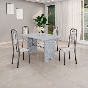 Quer deixar sua casa completa e prática? Uma dica bacana de como transformar o seu lar, deixando-o mais receptivo e bonito? Então você precisa de móveis indispensáveis para deixar seu lar muito mais aconchegante, receptivo e sempre disponível para receber a visita de amigos, familiares e convidados. Você vai se apaixonar por este incrível e moderno Conjunto de Mesa com 4 Cadeiras. Ideal para cozinha, ele é a melhor opção para completar o espaço que você desejar. Aproveite!! Medida da Mesa (A x L x P): 75,8 cm x 120 cm x 75 cm Peso da Mesa: 81,74 kg Mesa suporta até: 10 kg Acabamento da Cadeira/Banco: Pintura Texturizada Acabamento da Mesa: Pintura Texturizada Ambiente Principal: Cozinha Cadeira/Banco estofada: Encosto e Assento Estofados Cadeira/Banco suporta até: 120 kg codigo_ean: 7900288145055 Complexidade da Montagem: Baixa: pode ser montado por uma pessoa sozinha Cor: Arabesco / Prata Cor do Produto: Arabesco / Prata Cor Secundária: Bege De Canto (Canto Alemão): Não Enchimento do Assento: Espuma D-16 Escala de Brilho: Brilhante Espessura do Tampo: 1,5 mm Estrutura do Assento: MDP Formato do Tampo: Retangular Itens Inclusos: 1 Mesa, 4 Cadeiras, Manual de Montagem e Kit Ferragens Linha ou Coleção: Lara Manual de Montagem e Instalação: https://product-hub-prd.madeiramadeira.com.br/992496/documents/a569a9f7-62ad-4d0c-b964-a1fc8bc5da022823687352817442347349606.pdf Marca: Soma Móveis Material da Base da Mesa: Aço Material da Estrutura da Cadeira: Aço Material do Tampo: Granito Medida da Cadeira/Banco (A x L x P): 105 cm x 37 cm x 40 cm Medida do Tampo (L x C x E): 120cm x 75cm x 1,5 cm Mesa Extensível: Não Necessita Montagem: Sim Origem do Produto: Nacional Peso da Cadeira/Banco: 2,7 kg Possui Apoio Para os Pés: Não Possui Suporte Giratório: Não Quantidade de Cadeiras: 4 Quantidade de Lugares: 04 Recomendações de Uso, Manutenção e Limpeza: Não permitir que molhe os pés da base, usar um pano de tecido macio e seco, evitar detergentes, alvejantes e produtos químicos de limpeza; no tampo usar tecido macio levemente umedecido. Revestimento da Cadeira/Banco: Couro Ecológico Sistema de Montagem: Parafusos