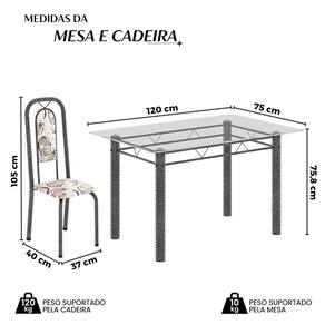 Quer deixar sua casa completa e prática? Uma dica bacana de como transformar o seu lar, deixando-o mais receptivo e bonito? Então você precisa de móveis indispensáveis para deixar seu lar muito mais aconchegante, receptivo e sempre disponível para receber a visita de amigos, familiares e convidados. Você vai se apaixonar por este incrível e moderno Conjunto de Mesa com 4 Cadeiras. Ideal para cozinha, ele é a melhor opção para completar o espaço que você desejar. Aproveite!! Medida da Mesa (A x L x P): 75,8 cm x 120 cm x 75 cm Peso da Mesa: 19,15 kg Mesa suporta até: 10 kg Acabamento da Cadeira/Banco: Pintura Texturizada Acabamento da Mesa: Pintura Texturizada Ambiente Principal: Cozinha Cadeira/Banco estofada: Encosto e Assento Estofados Cadeira/Banco suporta até: 120 kg codigo_ean: 7900288145130 Complexidade da Montagem: Baixa: pode ser montado por uma pessoa sozinha Cor: Arabesco / Prata Cor do Produto: Arabesco / Prata Cor Secundária: Bege De Canto (Canto Alemão): Não Enchimento do Assento: Espuma D-16 Escala de Brilho: Brilhante Espessura do Tampo: 6 mm Espessura do Vidro: 6 mm Estrutura do Assento: MDP Formato do Tampo: Retangular Itens Inclusos: 1 Mesa, 4 Cadeiras, Manual de Montagem e Kit Ferragens Linha ou Coleção: Lara Manual de Montagem e Instalação: https://cdn2.madeiramadeira.com.br/atributo/soma-moveis-ltda/2818001-3528-17441405246925.pdf Marca: Soma Móveis Material da Base da Mesa: Aço Material da Estrutura da Cadeira: Aço Material do Tampo: Vidro Medida da Cadeira/Banco (A x L x P): 105 cm x 37 cm x 40 cm Medida do Tampo (L x C x E): 120cm x 75cm x 0,6 cm Mesa Extensível: Não Necessita Montagem: Sim Origem do Produto: Nacional Peso da Cadeira/Banco: 2,7 kg Possui Apoio Para os Pés: Não Quantidade de Cadeiras: 4 Quantidade de Lugares: 04 Recomendações de Uso, Manutenção e Limpeza: Não permitir que molhe os pés da base, usar um pano de tecido macio e seco, evitar detergentes, alvejantes e produtos químicos de limpeza; no tampo usar tecido macio levemente umedecido. Revestimento da Cadeira/Banco: Couro Ecológico Sistema de Montagem: Parafusos Vidro Temperado: Sim