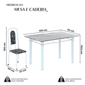 Quer deixar sua casa completa e prática? Uma dica bacana de como transformar o seu lar, deixando-o mais receptivo e bonito? Então você precisa de móveis indispensáveis para deixar seu lar muito mais aconchegante, receptivo e sempre disponível para receber a visita de amigos, familiares e convidados. Você vai se apaixonar por este incrível e moderno Conjunto de Mesa com 4 Cadeiras. Ideal para cozinha, ele é a melhor opção para completar o espaço que você desejar. Aproveite!! Medida da Mesa (A x L x P): 75,8 cm x 120 cm x 75 cm Peso da Mesa: 54,8 kg Mesa suporta até: 8 kg Acabamento da Cadeira/Banco: Pintura Texturizada Acabamento da Mesa: Pintura Texturizada Ambiente Principal: Cozinha Cadeira/Banco estofada: Encosto e Assento Estofados Cadeira/Banco suporta até: 120 kg codigo_ean: 7900288139634 Complexidade da Montagem: Baixa: pode ser montado por uma pessoa sozinha Cor: Preto/Branco Cor do Produto: Preto/Branco Cor Secundária: Preto De Canto (Canto Alemão): Não Enchimento do Assento: Espuma D-16 Escala de Brilho: Brilhante Espessura do Tampo: 1,5 mm Estrutura do Assento: MDP Formato do Tampo: Retangular Itens Inclusos: 1 Mesa, 4 Cadeiras, Kit Ferragens e Manual de Montagem Linha ou Coleção: Lara Manual de Montagem e Instalação: https://product-hub-prd.madeiramadeira.com.br/981815/documents/f4928701-0b63-4f97-b250-f204f8c6b4a62751668352817423268707839.pdf Marca: Soma Móveis Material da Base da Mesa: Aço Material da Estrutura da Cadeira: Aço Material do Tampo: Granito Medida da Cadeira/Banco (A x L x P): 105 cm x 37 cm x 40 cm Medida do Tampo (L x C x E): 120cm x 75cm x 1,5 cm Mesa Extensível: Não Necessita Montagem: Sim Origem do Produto: Nacional Peso da Cadeira/Banco: 2,7 kg Possui Apoio Para os Pés: Não Quantidade de Cadeiras: 4 Quantidade de Lugares: 04 Recomendações de Uso, Manutenção e Limpeza: Não permitir que molhe os pés da base, usar um pano de tecido macio e seco, evitar detergentes, alvejantes e produtos químicos de limpeza; no tampo usar tecido macio levemente umedecido. Revestimento da Cadeira/Banco: Couro Ecológico Sistema de Montagem: Parafusos