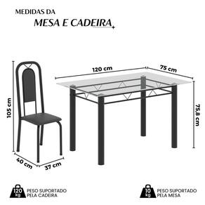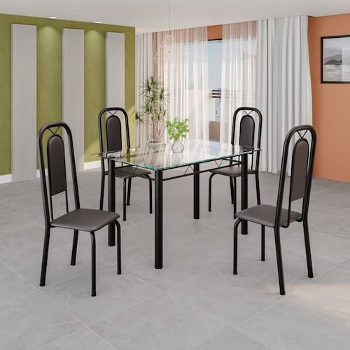 Quer deixar sua casa completa e prática? Uma dica bacana de como transformar o seu lar, deixando-o mais receptivo e bonito? Então você precisa de móveis indispensáveis para deixar seu lar muito mais aconchegante, receptivo e sempre disponível para receber a visita de amigos, familiares e convidados. Você vai se apaixonar por este incrível e moderno Conjunto de Mesa com 4 Cadeiras. Ideal para cozinha, ele é a melhor opção para completar o espaço que você desejar. Aproveite!! Medida da Mesa (A x L x P): 75,8 cm x 120 cm x 75 cm Peso da Mesa: 19,15 kg Mesa suporta até: 10 kg Acabamento da Cadeira/Banco: Pintura Texturizada Acabamento da Mesa: Pintura Texturizada Ambiente Principal: Cozinha Cadeira/Banco estofada: Encosto e Assento Estofados Cadeira/Banco suporta até: 120 kg codigo_ean: 7900288145253 Complexidade da Montagem: Baixa: pode ser montado por uma pessoa sozinha Cor: Preto Cor do Produto: Preto Cor Secundária: Preto De Canto (Canto Alemão): Não Enchimento do Assento: Espuma D-16 Escala de Brilho: Semi-Brilho Espessura do Tampo: 6 mm Espessura do Vidro: 6 mm Estrutura do Assento: MDP Formato do Tampo: Retangular Itens Inclusos: 1 Mesa, 4 Cadeiras, Manual de Montagem e Kit Ferragens Linha ou Coleção: Lara Manual de Montagem e Instalação: https://cdn2.madeiramadeira.com.br/atributo/soma-moveis-ltda/2818001-3528-17441405246925.pdf Marca: Soma Móveis Material da Base da Mesa: Aço Material da Estrutura da Cadeira: Aço Material do Tampo: Vidro Medida da Cadeira/Banco (A x L x P): 105 cm x 37 cm x 40 cm Medida do Tampo (L x C x E): 120cm x 75cm x 0,6 cm Mesa Extensível: Não Necessita Montagem: Sim Origem do Produto: Nacional Peso da Cadeira/Banco: 2,7 kg Possui Apoio Para os Pés: Não Quantidade de Cadeiras: 4 Quantidade de Lugares: 04 Recomendações de Uso, Manutenção e Limpeza: Não permitir que molhe os pés da base, usar um pano de tecido macio e seco, evitar detergentes, alvejantes e produtos químicos de limpeza; no tampo usar tecido macio levemente umedecido. Revestimento da Cadeira/Banco: Couro Ecológico Sistema de Montagem: Parafusos Vidro Temperado: Sim