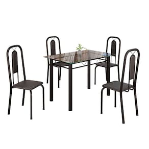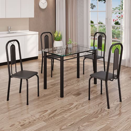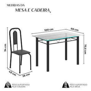 Quer deixar sua casa completa e prática? Uma dica bacana de como transformar o seu lar, deixando-o mais receptivo e bonito? Então você precisa de móveis indispensáveis para deixar seu lar muito mais aconchegante, receptivo e sempre disponível para receber a visita de amigos, familiares e convidados. Você vai se apaixonar por este incrível e moderno Conjunto de Mesa com 4 Cadeiras. Ideal para cozinha, ele é a melhor opção para completar o espaço que você desejar. Aproveite!! Medida da Mesa (A x L x P): 75,8 cm x 100 cm x 60 cm Peso da Mesa: 15,46 kg Mesa suporta até: 10 kg Acabamento da Cadeira/Banco: Pintura Texturizada Acabamento da Mesa: Pintura Texturizada Ambiente Principal: Cozinha Cadeira/Banco estofada: Encosto e Assento Estofados Cadeira/Banco suporta até: 120 kg codigo_ean: 7900288144959 Complexidade da Montagem: Baixa: pode ser montado por uma pessoa sozinha Cor: Preto Cor do Produto: Preto Cor Secundária: Preto De Canto (Canto Alemão): Não Enchimento do Assento: Espuma D-16 Escala de Brilho: Semi-Brilho Espessura do Tampo: 6 mm Espessura do Vidro: 6 mm Estrutura do Assento: MDP Formato do Tampo: Retangular Itens Inclusos: 1 Mesa, 4 Cadeiras, 1 Kit Ferragens, 1 Manual de Montagem Linha ou Coleção: Lívia Manual de Montagem e Instalação: https://product-hub-prd.madeiramadeira.com.br/981325/documents/ecdd6fb1-5e94-4488-b269-99cb2da5a26b2743245352817418953034446.pdf Marca: Soma Móveis Material da Base da Mesa: Aço Material da Estrutura da Cadeira: Aço Material do Tampo: Vidro Medida da Cadeira/Banco (A x L x P): 94 cm x 36 cm x 40 cm Medida do Tampo (L x C x E): 100cm x 60cm x 0,6cm Mesa Extensível: Não Necessita Montagem: Sim Origem do Produto: Nacional Peso da Cadeira/Banco: 2,28 kg Possui Apoio Para os Pés: Não Quantidade de Cadeiras: 4 Quantidade de Lugares: 04 Recomendações de Uso, Manutenção e Limpeza: Não permitir que molhe os pés da base, usar um pano de tecido macio e seco, evitar detergentes, alvejantes e produtos químicos de limpeza; no tampo usar tecido macio levemente umedecido. Revestimento da Cadeira/Banco: Couro Ecológico Sistema de Montagem: Parafusos Vidro Temperado: Sim