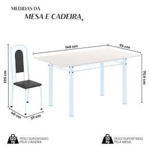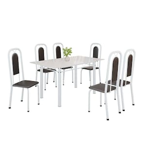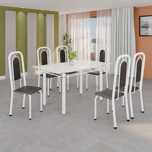 Quer deixar sua casa completa e prática? Uma dica bacana de como transformar o seu lar, deixando-o mais receptivo e bonito? Então você precisa de móveis indispensáveis para deixar seu lar muito mais aconchegante, receptivo e sempre disponível para receber a visita de amigos, familiares e convidados. Você vai se apaixonar por este incrível e moderno Conjunto de Mesa com 6 Cadeiras. Ideal para cozinha, ele é a melhor opção para completar o espaço que você desejar. Aproveite!! Medida da Mesa (A x L x P): 75,8 cm x 140 cm x 75 cm Peso da Mesa: 21,35 kg Mesa suporta até: 10.0000 Acabamento da Cadeira/Banco: Pintura Texturizada Acabamento da Mesa: Pintura Texturizada Ambiente Principal: Cozinha Cadeira/Banco Estofada: Encosto e Assento Estofados Cadeira/Banco estofada: Encosto e Assento Estofados Cadeira/Banco suporta até: 120.0000 codigo_ean: 7900288146526 Complexidade da Montagem: Baixa: pode ser montado por uma pessoa sozinha Cor: Preto / Branco Cor do Produto: Preto / Branco Cor Secundária: Cinza De Canto (Canto Alemão): Não Enchimento do Assento: Espuma D-16 Escala de Brilho: Brilhante Espessura do Tampo: 6 mm Espessura do Vidro: 6 mm Estrutura do Assento: MDP Formato do Tampo: Retangular Itens Inclusos: 1 Mesa, 6 Cadeiras, Manual de Montagem e Kit Ferragens Linha ou Coleção: Lara Manual de Montagem e Instalação: https://product-hub-prd.madeiramadeira.com.br/558081149/documents/ef68166b-6c87-4469-a615-ae150c701850a2821966352817442234269539.pdf Marca: Soma Móveis Material da Base da Mesa: Aço Material da Estrutura da Cadeira: Aço Material do Tampo: Vidro Medida da Cadeira/Banco (A x L x P): 105 cm x 37 cm x 40 cm Medida do Tampo (L x C x E): 140cm x 75cm x 0,6cm Mesa Extensível: Não Necessita Montagem: Sim Origem do Produto: Nacional Peso da Cadeira/Banco: 2,7 kg Possui Apoio Para os Pés: Não Quantidade de Cadeiras: 6 Quantidade de Lugares: 06 Recomendações de Uso, Manutenção e Limpeza: Não permitir que molhe os pés da base, usar um pano de tecido macio e seco, evitar detergentes, alvejantes e produtos químicos de limpeza; no tampo usar tecido macio levemente umedecido. Revestimento da Cadeira/Banco: Couro Ecológico Sistema de Montagem: Parafusos Vidro Temperado: Sim