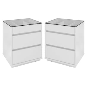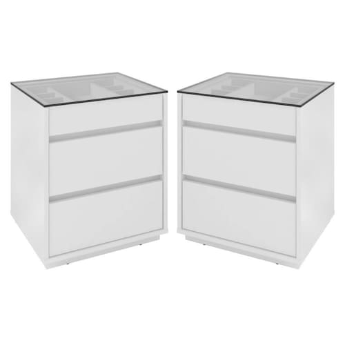Feitos em MDP 25/15mm. Possui 3 gavetas com corrediças telescópicas possibilitando a abertura total da gaveta com deslizamento suave preciso e resistente e tampo feito de vidro.