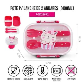 A hora do lanche ficou muito mais divertida com o pote para lanche de 2 andares da coleção PIMPOLHOS. Com capacidade para 400ml, possui divisórias na parte inferior para facilitar a separação dos alimentos e uma bandeja com encaixe para os talheres que acompanham o kit; e tampa com fechamento em travas de segurança. É perfeito para passeios, viagens e escolinha. Produto livre de BPA e com qualidade Jacki Design. Conheça a linha completa da coleção PIMPOLHOS e complete o seu kit! (INSTRUÇÕES DE USO: Retire a tampa antes de levar ao micro-ondas; usar somente para aquecer comida, não para cozinhar; Vai ao freezer e lava-louças; Temperatura de uso: -20C ~100C; Limpe usando uma esponja macia e detergente neutro.