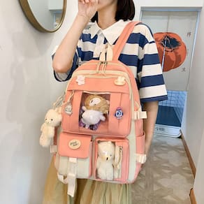 - ??O pacote inclui?Conjunto de 5 peças: 1 mochila, 1 bolsa de ombro, 1 caixa de lápis, 1 sacola, 1 bolsa pequena com cordão. Vem com 4 pingentes de pelúcia e um conjunto de pinos (cores e estilos aleatórios). Você também pode fazer você mesmo o lindo conjunto de mochilas com outros acessórios kawaii que você tem.