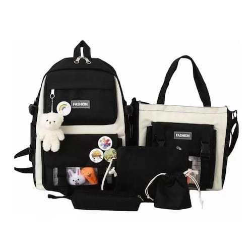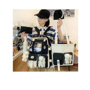 Conjunto de mochilas Kawaii com pingente: prepare a bolsa de volta às aulas para você, incluindo:\ n1 mochila\ n1 bolsa de lápis\ n1 bolsa de ombro\ n1 bolsa\ n1 bolsa\ n1 bolsa\ nRelógio: 4 bolsas de tamanhos diferentes\ n1. Mochila escolar: 30x12x42 cm. Pode conter um computador de 14 polegadas 2. Bolsa de ombro: 29x14x32 cm. Pode conter vários livros3. Boletim: 20x15 cm. Coloque coisas pequenas4. Bolsa de papelaria: 20x5 cm. Papelaria durável e impermeável: feita de tecido Oxford respirável, impermeável e resistente ao desgaste. Garante uma longa vida útil. O zíper de alta qualidade garante um uso durável e macio. Ao mesmo tempo, as alças são reforçadas. Garante a capacidade de transporte da embalagem.\ nGrande capacidade: a mochila e a bolsa fornecem aproximadamente 20 L de capacidade. Que é grande o suficiente para guardar seus pertences diários. Você pode colocar seu laptop. Livros e outros acessórios com você. Presente ideal: o lindo conjunto de bolsas é ótimo para estudantes e colegas como presente de aniversário. De volta à escola. Natal. O design de moda os atrairá e eles adorarão esse presente.