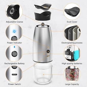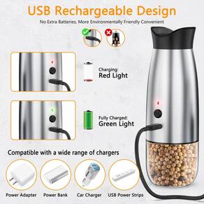 - [Conjunto de moedor de sal e pimenta recarregável USB] A tecnologia avançada de carregamento rápido tipo C permite que o moedor de sal e pimenta receba uma carga completa em 1 hora. Apenas uma carga de 5 minutos satisfará suas necessidades básicas diárias de moagem. Suporte para usá-lo enquanto estiver carregando, se você estiver com pressa. Uma solução que economiza dinheiro não desperdiça mais baterias primárias para proteção ambiental